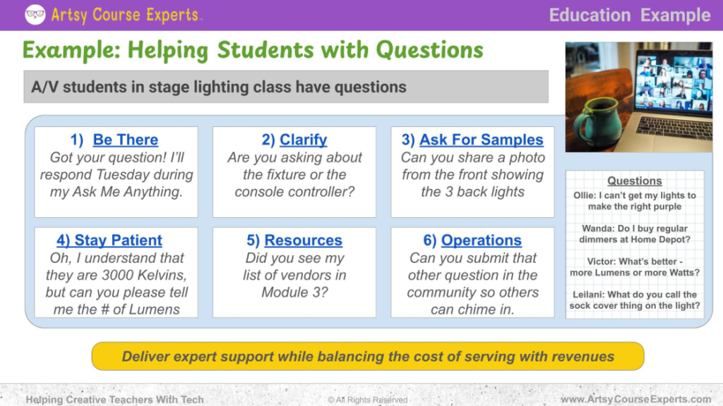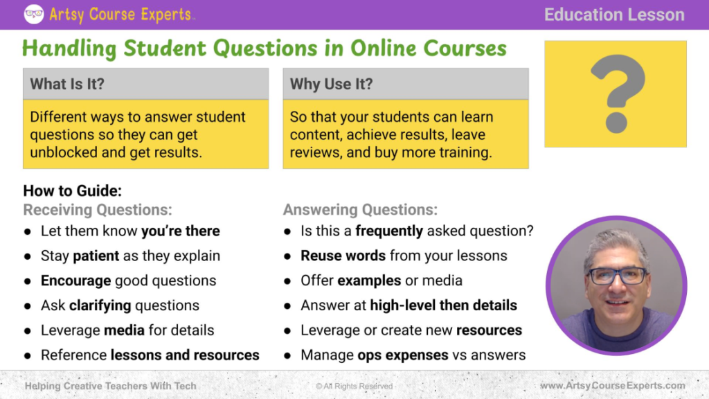 Handling student questions effectively is an art that complements your creative teaching. It involves setting up processes and using resources to ensure students feel supported, while also protecting your time and creative energy. In essence, it’s about creating a reliable system that: